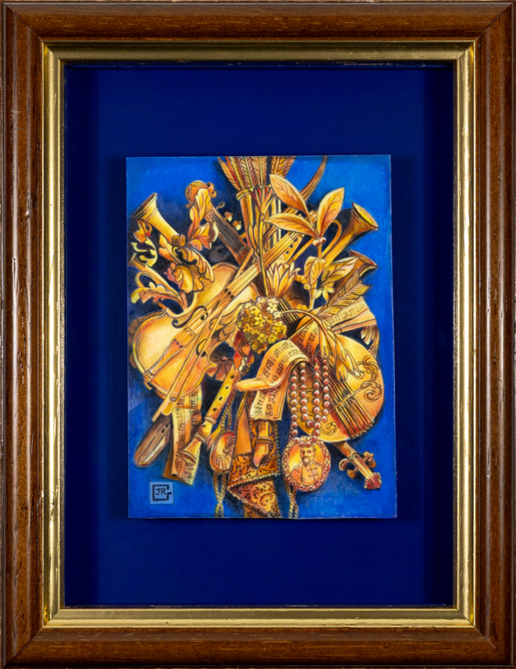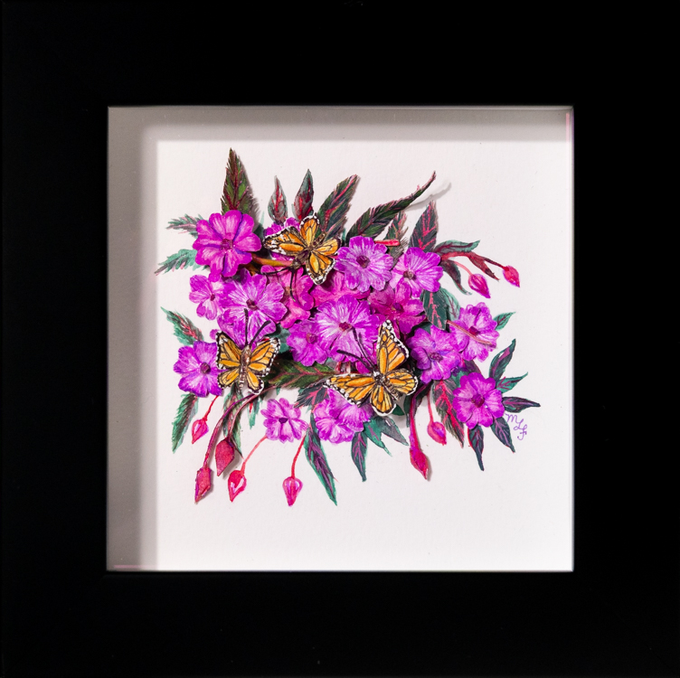 ![]() Golden Wings in a Sea of Violet - $500 - #1661 Hand Cut Paper, Watercolor, Gouache 2 3/4 x 2 3/4 x 1 Melinda Fabian - PA |