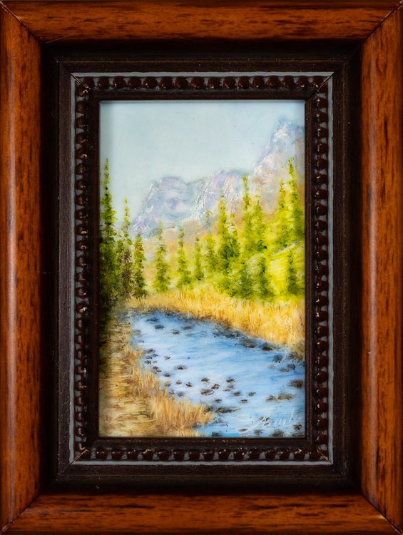 ![]() Rocky Mountain High - $375 - #2222 Oil on Ivorine - 3 x 2 Linda G. Lawler - VA |